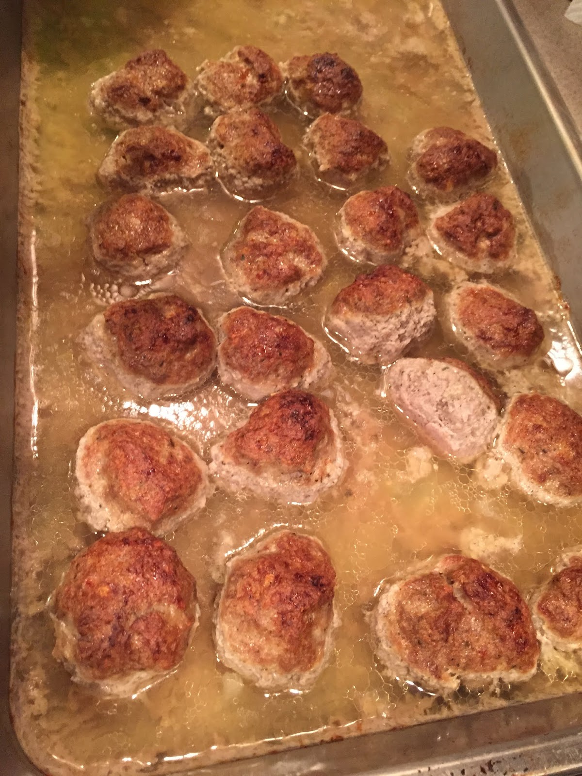 Put some gloves on, mix with your hands, and grab a 4 tbsp stainless steel scoop to dip exactly 10 meatballs/lb of meat. Bake at 450 deg for 40 min in one inch of water in the bottom of the baking pan. Set aside while the sauce is cooking.